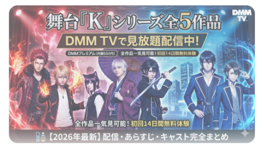舞台『K』シリーズ全5作品は、DMM TVで見放題配信中です。月額550円(税込)のDMMプレミアムに加入すれば、初演から最終章までまとめて視聴できます。初回14日間の無料体験を使えば、費用ゼロでシリーズを一気見することも可能です。【配信状況まとめ】202... -