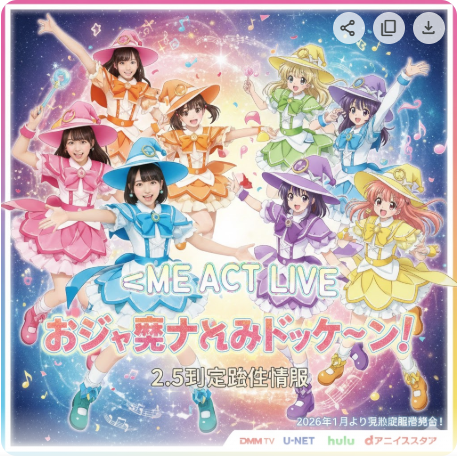 ストーリー自体は舞台オリジナルの完全新作のため、原作アニメを未視聴でも十分に楽しめます。舞台冒頭でキャラクター紹介やアニメのあらすじに相当するシーンがテンポよく描かれるので、初見でも置いてけぼりになる心配はありません。ただし、変身パロディやメタギャグの”元ネタ”がわかると面白さは倍増します。アニメ第1期(全12話)のうち2〜3話を見ておくだけでも雰囲気は十分つかめるので、時間に余裕があれば予習しておくのがおすすめです。アニメはDMM TV、dアニメストア、U-NEXTなどで配信中です。