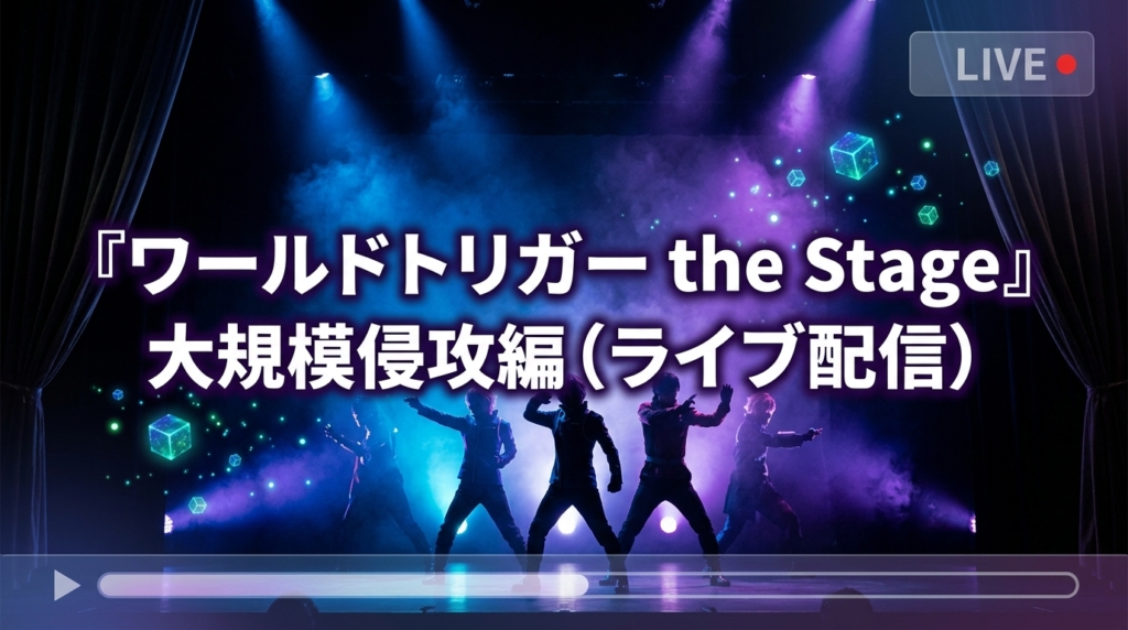 『ワールドトリガー the Stage』大規模侵攻編(通称:ワーステ)のライブ配信は、2022年8月にDMM.com(現DMM TV)にて東京公演・京都公演の計4公演が配信されました。2026年3月現在、ライブ配信およびアーカイブ配信はすべて終了しています。今すぐ視聴し...