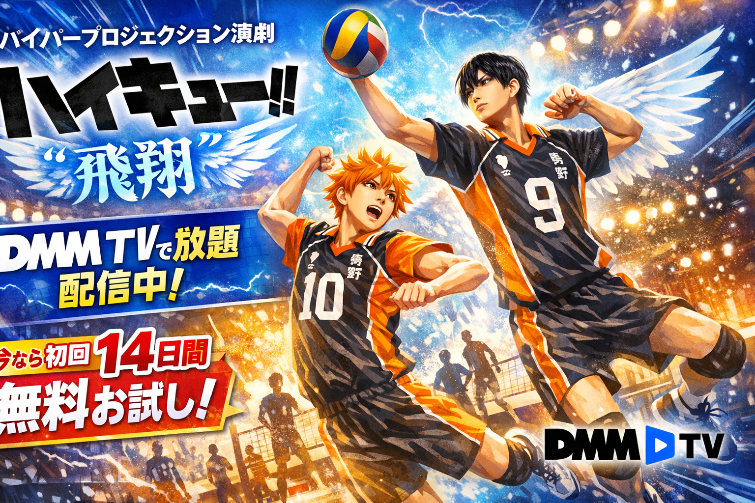 2026年3月1日時点で、ハイパープロジェクション演劇『ハイキュー!!』”飛翔”はDMM TVにて見放題配信中です。DMMプレミアム(月額550円・税込)に加入すれば、いつでも好きなタイミングで繰り返し視聴できます。初めてDMM TVを利用する方は初回14日間無料のお試し期間がありますので、気軽に作品をチェックしてみてください。
