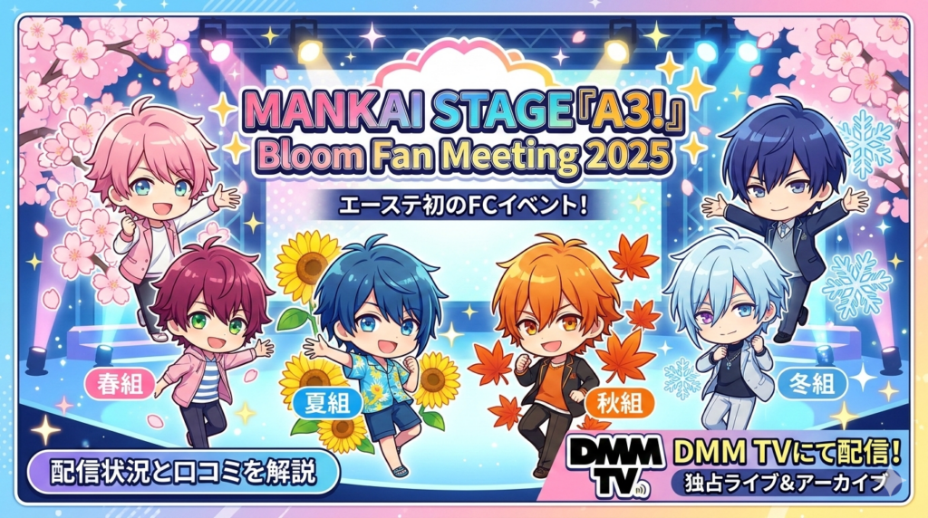 【MANKAI STAGE『A3!』Bloom Fan Meeting 2025はDMM TVで見れる?配信状況と口コミを徹底解説】MANKAI STAGE『A3!』Bloom Fan Meeting 2025は、エーステ初のファンクラブ会員限定イベントとして2025年9月に開催され、DMM TVにて独占ライブ配信およびアーカ... -