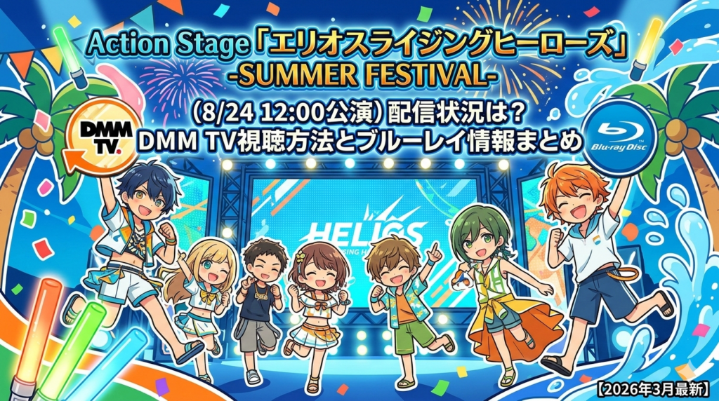 【エリステ「サマーフェスティバル」8/24 12:00公演の配信状況は?DMM TVでの視聴方法とブルーレイ情報まとめ【2026年3月最新】】エリステシリーズ初のライブ公演として大きな話題を呼んだ「エリオスライジングヒーローズ」-サマーフェスティバル-。2025年... -