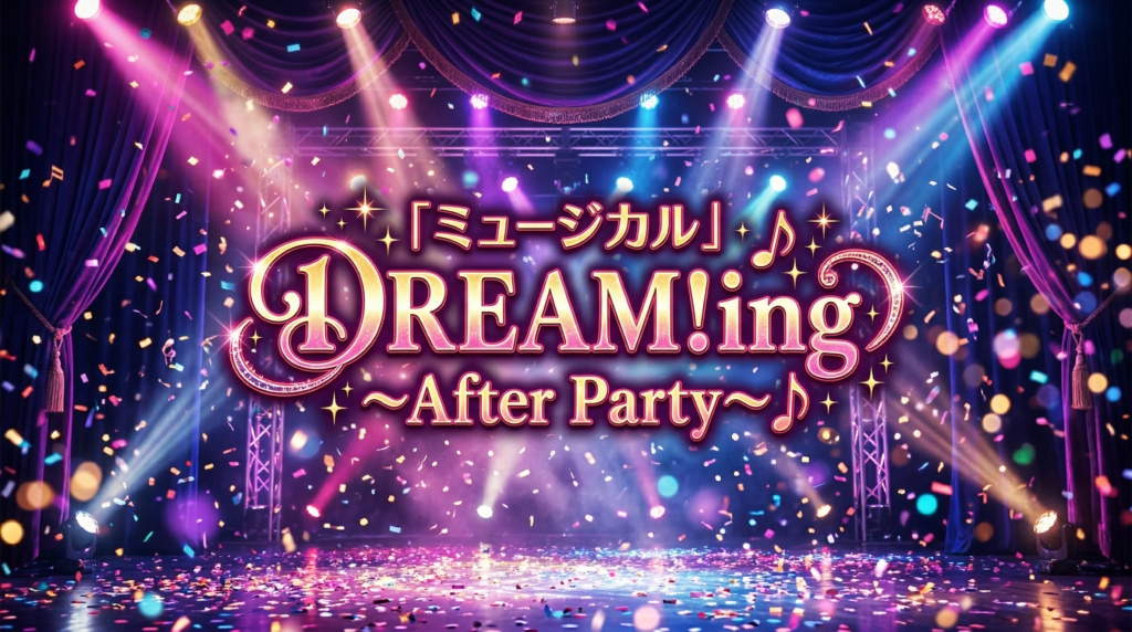 ミュージカル「DREAM!ing~After Party~」は、"Dミュ"シリーズの集大成となるファンミーティングイベントとして2025年8月9日に開催されました。DMM TVでの独占ライブ配信・アーカイブ配信はすでに終了していますが、シリーズ過去作品はDMM TVの見放題で視... -