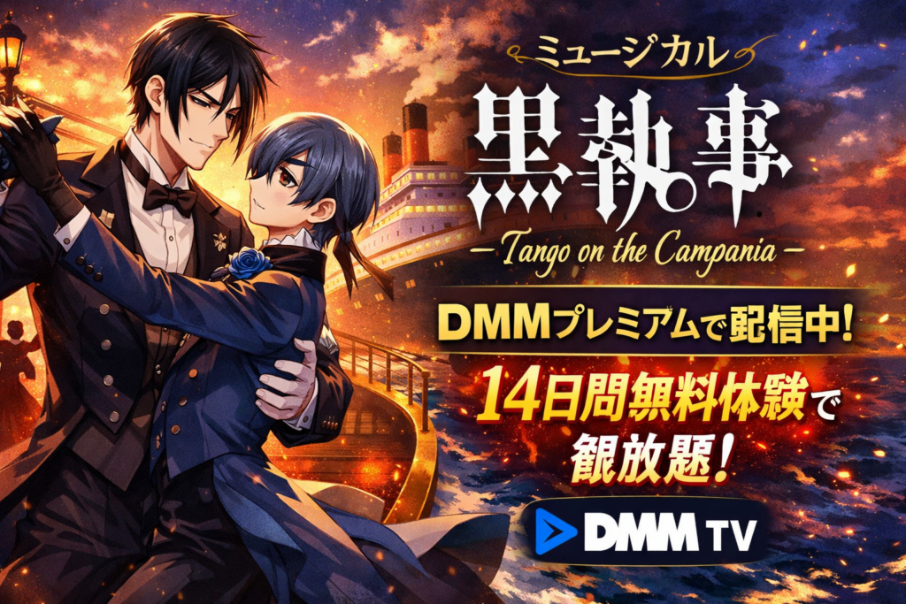 ミュージカル『黒執事』-Tango on the Campania-を自宅で観たい方に朗報です。本作はDMM TV(DMMプレミアム)の見放題対象作品として配信中です。初回14日間の無料体験を利用すれば、実質0円で豪華客船編の熱いステージを堪能できます。【ミュージカル『黒... -