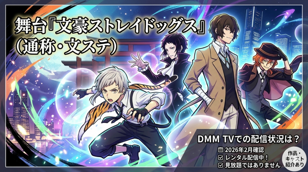 舞台『文豪ストレイドッグス』(文ステ)のDMM TV配信状況を2026年2月最新情報で解説。全8作品の視聴順番・キャスト・見どころ・口コミまで徹底ガイド。アニメ版は全5シーズン見放題配信中です。 -
