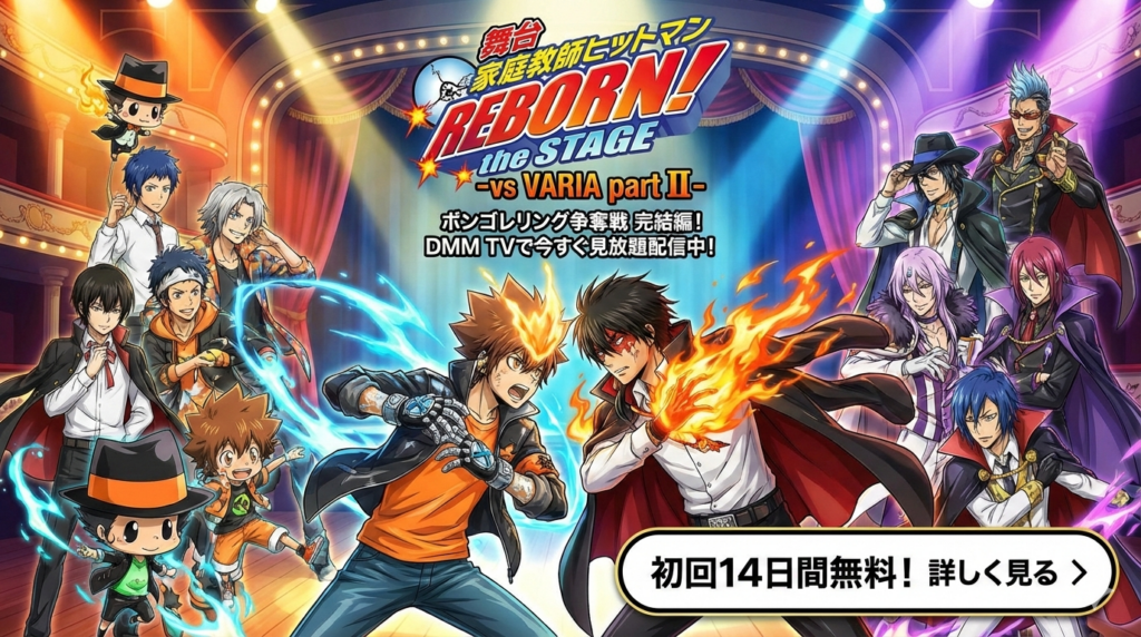 舞台『家庭教師ヒットマンREBORN!』the STAGE(リボステ)全6作品の配信状況を2026年3月最新情報で解説。DMM TVなら月額550円で全作品見放題。見る順番・キャスト・口コミ・無料視聴方法まで徹底ガイド。 -