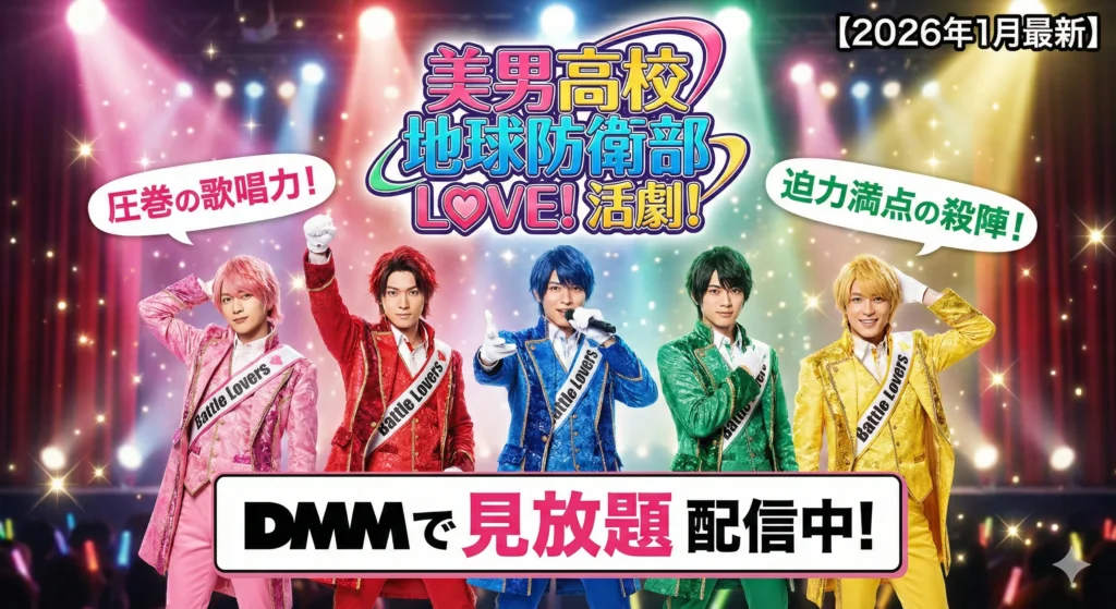 『美男高校地球防衛部LOVE!活劇!』はDMMで見放題配信中!圧巻の歌唱力と迫力満点の殺陣を今すぐ視聴可能。料金・無料体験の条件・視聴期限を徹底解説。【2026年1月最新情報】 -