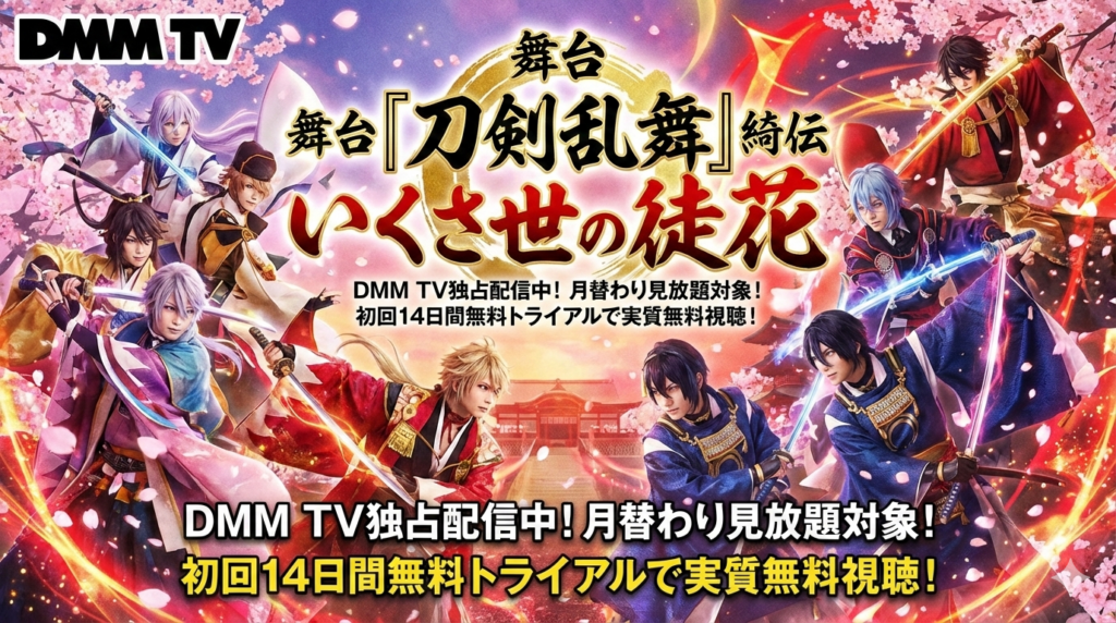 舞台『刀剣乱舞』綺伝 いくさ世の徒花のDMM TV配信状況を徹底解説。月替わり見放題やレンタル情報、初回14日間無料トライアルの活用法、口コミ・見どころまで2026年最新情報をまとめました。