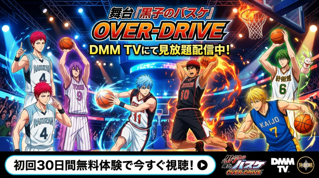 舞台『黒子のバスケ』OVER-DRIVEはDMM TVで見放題配信中。初回14日間無料体験あり。2026年2月28日時点の配信状況・見どころ・口コミ・視聴方法を徹底まとめ。黄瀬VS青峰の熱い試合を自宅で何度でも楽しめます。 -