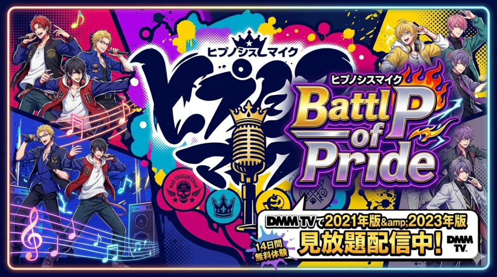 『ヒプノシスマイク Rule the Stage -Battle of Pride-』の配信状況を2026年2月最新情報でまとめました。DMM TVなら2021年版・2023年版ともに見放題。初回14日間無料体験で視聴可能です。 -