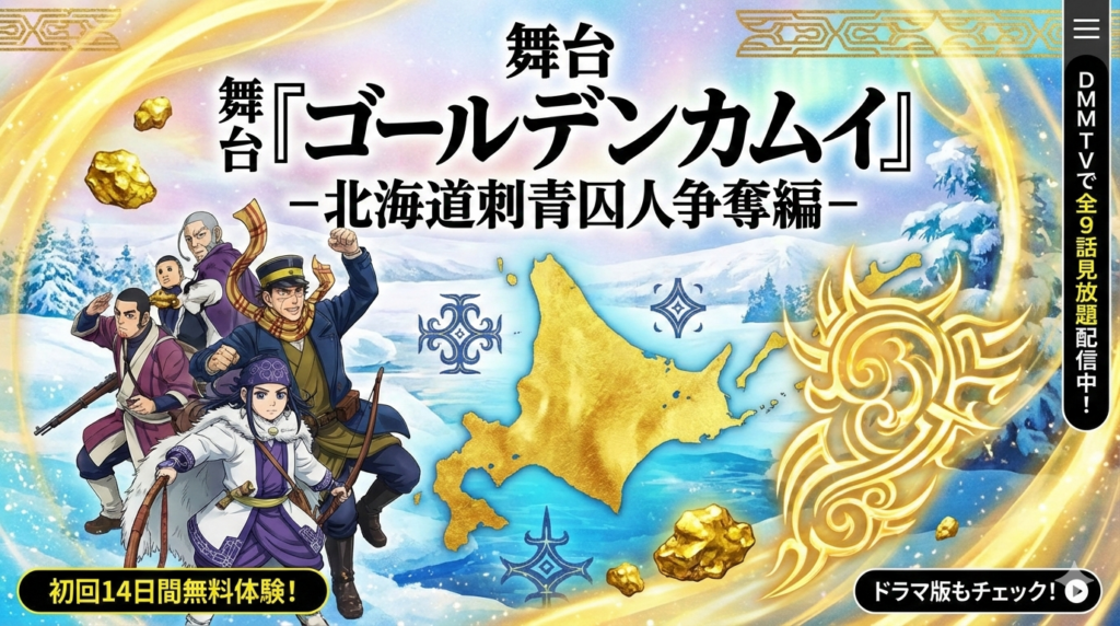 ドラマ『ゴールデンカムイ ―北海道刺青囚人争奪編―』はDMM TVで見放題配信中。月額550円で全9話を視聴でき、初回14日間は無料体験可能。作品情報・あらすじ・口コミ・映画最新作の予習情報までまとめました。