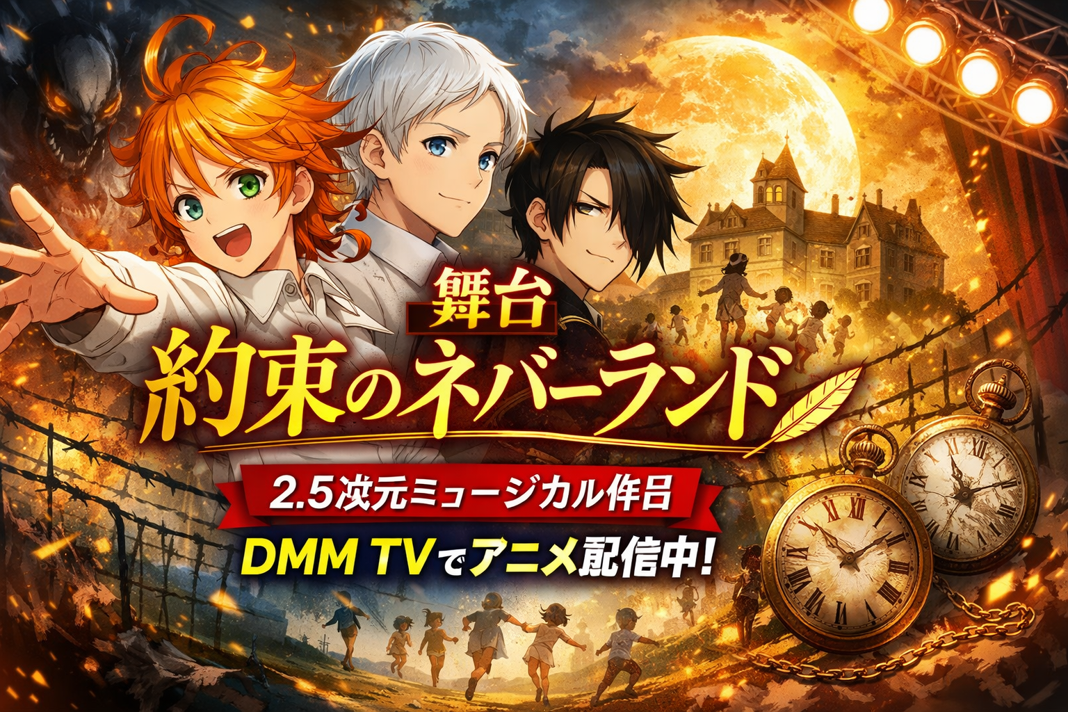「約束のネバーランド(約ネバ)」の2.5次元舞台作品を探している方へ。結論から言うと、2026年2月時点で舞台『約束のネバーランド』という2.5次元舞台作品は制作・上演されていません。ただし、DMM TVではTVアニメ版(第1期・第2期)が見放題で配信中です。