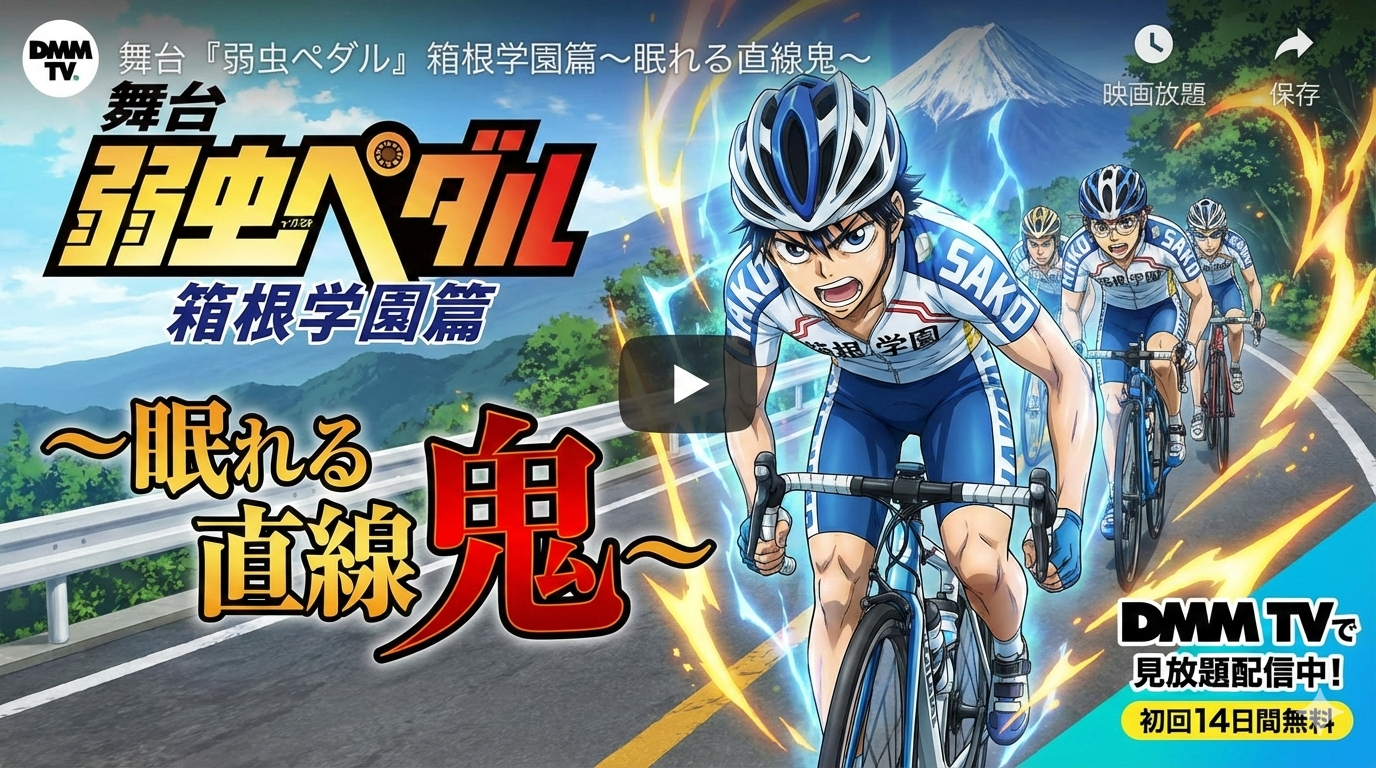舞台『弱虫ペダル』箱根学園篇~眠れる直線鬼~は、DMM TVで見放題配信中です。月額550円(税込)のDMMプレミアムに登録すれば、初回14日間の無料体験期間中に追加料金なしで視聴できます。ペダステ第2弾となる本作を、自宅でじっくり楽しみましょう。